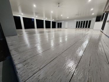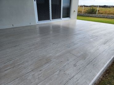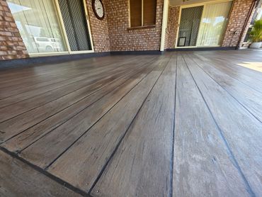 Concrete Timber Look Overlay applied to a 16m² back patio in Bargara. The slab required several repairs and a full diamond grind to strip away multiple layers of peeling paint before the new coating was applied.